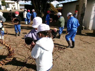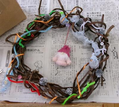 1年生も、2年生と一緒にサツマイモのつるでクリスマスのリース作りに挑戦しました。