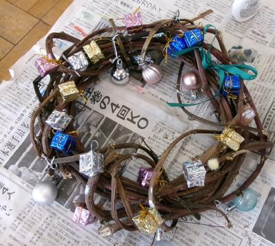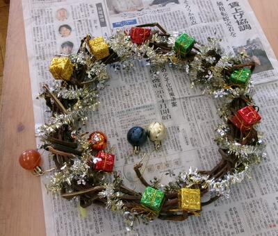 栽培していたサツマイモのつるを利用して、クリスマスのリースをつくりました。