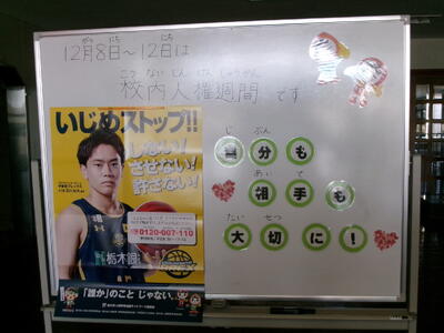 12月3日には、朝会で校長講話を行いました。「自分も周りの人も大切にする」、「差別や人を傷つけることばを使ってはいけない」などのお話をしました。