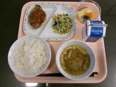ごはん、牛乳、モロのねぎソースかけ、かんぴょうのサラダ、うどのみそ汁、フルーツ