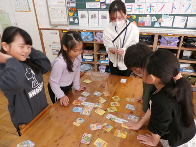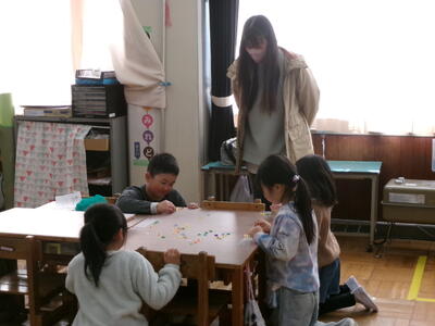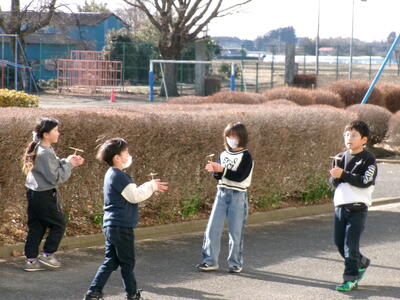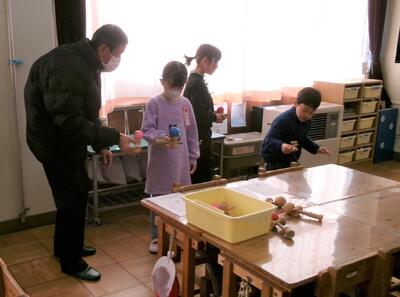 「おてだま」、「おはじき」、「かるた」、「けん玉」、「あやとり」、「はねつき」、「竹とんぼ」の7種類の昔遊びをとおして、ボランティアでお越しになった保護者や祖父母の皆様と楽しい時間を過ごしました。