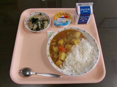 本日の献立は、麦ごはん、牛乳、チキンカレー、和風サラダ、紅白ゼリーです。