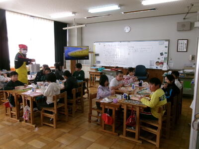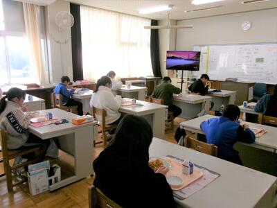12月17日、金田南学園小中一貫教育推進の活動として、金田南中学校の阿久津先生が本校に来校してくれました。6年生の授業を参観し、給食も一緒に食べてくださいました。